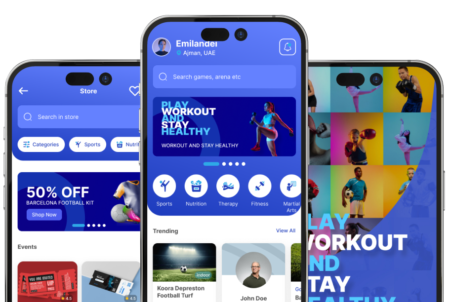 Transform your smartphone into a superpower with our all-encompassing app. Include a variety of workout plans catering to different fitness levels and goals, such as weight loss, muscle gain, or general well-being. User-friendly catalog showcasing fitness equipment, sportswear, and accessories. Incorporate a feature to help users find nearby playgrounds or sports facilities.Unleash the magic of entertainment wherever you go, with our app in hand